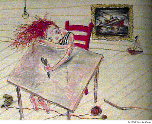 Schaschlikspießen und Stoffresten sieben Segelboote. Kein Boot ist wie das andere. Am gefährlichsten sieht das Piratenboot mit der bemalten Flagge aus. Ob Bertas Boote so gut schwimmen können wie sie aussehen? Es ist kaum Seegang und fast windstill. Alle Boote dümpeln so vor sich hin, keines kippt, keines kentert. Berta langweilt sich fast. Aber dann passiert es: Das Piratenboot fährt gerade guten Kurs, als es plötzlich in einem riesigen Fischmaul verschwindet. Weg ist es. |