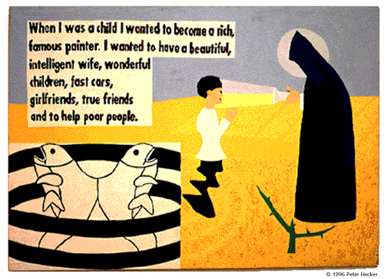 Diese Arbeit soll nicht die aussgestellten Bilder (der praktische Teil der Prüfung) oder die Motive ihrer Anfertigung erklären, da ja die Bilder meiner Meinung nach immer für sich sprechen. Außerdem handelt der Text nicht von seinem Titel "Wie werde ich als Künstler berühmt und reich", da ich die Antwort auf diese Frage ziemlich einfach und uninteressant fand und die Verwirklichung an die Grenzen meiner Persönlichkeit stößt. Aber dennoch werde ich es Ihnen in der Beilage auf der letzten Seite dieses Heftes mitteilen, damit meine Arbeit nicht verloren geht. Die Akteure dieses Werkes sind die Kunst, sowie zwei Künstler und ein Mensch, die in Wirklichkeit eine Person sind, und zwar ich selbst. Seine Gattung ist das Drama, weil ich auf diese Weise durch die Dialoge verschiedene Meinungen widerspiegeln kann und auch die in meiner Persönlichkeit sehr stark vorhandene Schizophrenie besser zum Ausdruck bringen konnte. Dieses Stück sollte eine Prüfungsarbeit werden, aber während des Schreibens ist es zur Selbstbekenntnis geworden, in der ich meine Beziehung zur Kunst zu klären versuchte. Deshalb ist es manchmal persönlich, geschwäzig und zu allgemein und deswegen bitte ich Sie um Nachsicht.