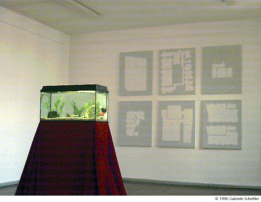 auf Nessel, 90 x 110 cm Aquarium 80 x 40 x 35, roter Stoff Acryl auf Wand, Buch