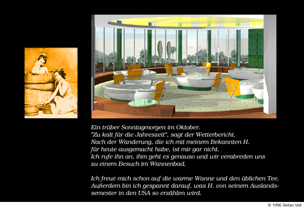 hatte.Andererseits bezieht er Aspekte des Badens aus anderen Kulturen mit ein: Die gesellige, sinnenfreudige Badestube des Mittelalters, wo auch Feste und Hochzeiten gefeiert wurden. Das japanische Bad, zu dem sich Bekannte, Verwandte und Nachbarn nicht in erster Linie des Badens wegen, sondern vielmehr zum Austausch von Neuigkeiten und Ihrer sozialen Kontakte wegen treffen. Das islamische Hammam. Ort der Muße, der Ruhe, der langen Gespräche und Geschichten. |
