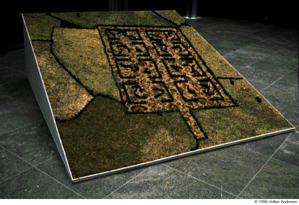 | "Meine Arbeiten funktionieren als Modelle von Landschaft und berufen sich nicht dogmatisch auf archaische Werkstoffe", äußert er sich grundsätzlich und verweist auf seine artifiziellen Objekte, die auch künstliche Materialien nicht verschmähen. In dieser konsequenten Position fordern sie den offenkundigen Widerspruch heraus und zeigen ihre Dialektik von Kunst und Natur. Die Verwendung von Kunststoffrasen, gefärbtem Kies sind - über Beton hinaus - Materialien, die Natur imitieren und stellen den romantischen philosophischen Satz in Frage, wonach der Künstler nicht nach der Natur arbeiten solle, sondern wie die Natur. Aber das hatte wohl Kant so nicht gemeint, sondern eher im übertragenen Sinne, zeigt aber doch, daß die künstlerische Tätigkeit sich sehr von idealisierter Verherrlichung fernhält und analytische, intellektuelle Formen annimmt. Volker Andresen ist in diesem Sinne ein Beobachter der Natur und dies am liebsten von "oben herab". |