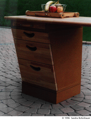 und die Arbeitsplatte aus dieser Arbeit vorstellen. In meiner Arbeit habe ich den gesamten Küchenbereich einschließlich den technischen Geräten zielgruppenspezifisch gestaltet. Exemplarisch möchte ich den Unterschrank und die Arbeitsplatte aus dieser Arbeit vorstellen. Die Bereiche Spüle, Arbeitsbereich und Kochstelle sind uneingeschränkt unterfahrbar. Einige Unterschränke sind notwendig, da bestimmte Utensilien am Benutzungsort gelagert werden sollen. Der Unterschrank hat eine Schräge von 15 Grad. So entsteht im unteren Bereich des Schrankes ein Freiraum von 150 mm. Dieser Freiraum hat den Vorteil, daß die Rollstuhlbenutzer näher an die Arbeitsplatte heranfahren können und mehr Platz beim Rangieren vorhanden ist. Um einer Stoßgefahr entgegenzuwirken wurde auf Griffe verzichtet. Sehr groß dimensionierte Greifmulden gewährleisten, daß selbst Hände, die in der Motorik eingeschränkt sind, die Schubfächer öffnen können. Die Greifmulden sind handunterstützend gestaltet. Zusätzlich sitzt die Greifmulde schräg in der Schubfachfront, so daß dieses noch greifunterstützend wirkt. Die Schubfächer sind 100, 200 und 250 mm hoch. Vollauszüge erlauben eine volle Ausnutzung des Stauraumes. Die Höhe des schrägen Unterschrankes mit Sockel beträgt 690mm. Der verbleibende Freiraum zwischen schrägem Unterschrank und auf individueller Höhe montierter Arbeitsplatte wird mit einer Blende ausgefüllt. In diesem Fall ist die Blende 60 mm hoch und ist mit einem Ausziehtisch bestückt. Der Korpus des Schrankes ist aus MDF, welches farbig lackiert wird. Die Frontplatten der Schubfächer, als auch der Ausziehtisch und die Arbeitsplatte bestehen aus stäbchenverleimtem Buchenholz. Die Arbeitsplatte ist vorne abgerundet und auf der Arbeitsplatte sind 30 mm breite Rinnen eingefräst, in denen verschiedene Hilfsmittel geführt werden. Eines der Hilfsmittel ist ein Rollwagen für Küchengeräte, der von der hinteren Rinne bis zur vorderen gezogen werden kann. Die Räder werden in den 5mm tiefen Rinnen gebremst. Zusätzlich dient die vordere Rinne als Handlauf und als Sammelbecken für Krümel und andere Rückstände. Zusammenfassend kann man sagen, daß die Kombination des schrägen Unterschrankes mit der Arbeitsplatte und den Hilfsmitteln den Arbeitsablauf von älteren und / oder behinderten Menschen im Küchenbereich erheblich erleichtert. |